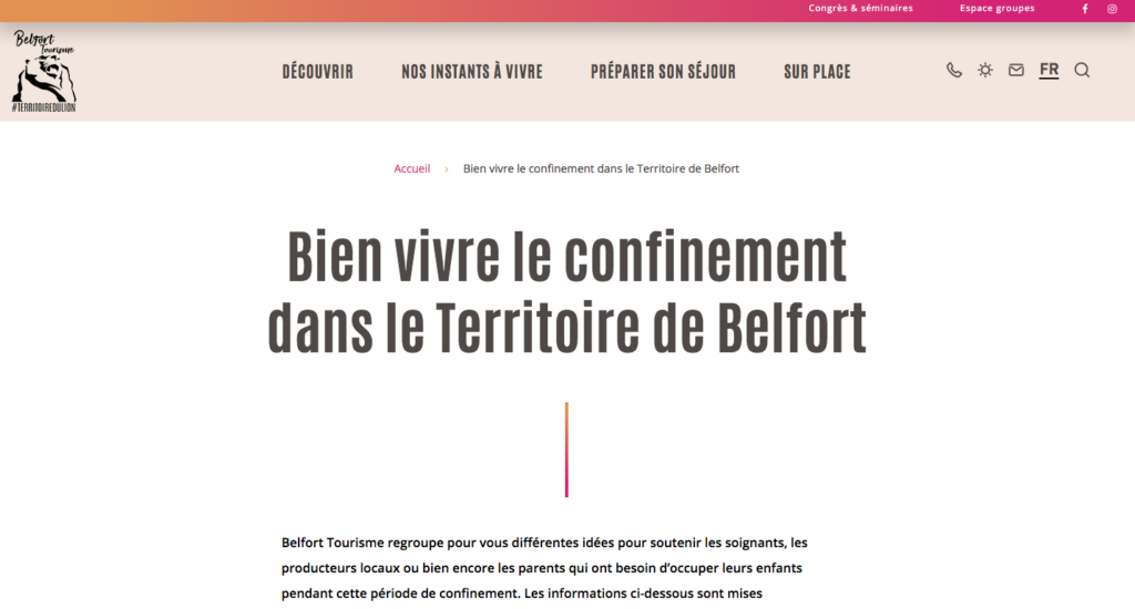 Belfort tourisme a créé́ la page Bien vivre le confinement sur son site web. « Ici sont regroupées différentes idées pour soutenir les soignants, les producteurs locaux ou encore les parents qui ont besoin d’occuper leurs enfants pendant cette période de confinement », indique le communiqué de presse de Belfort tourisme. Les internautes trouveront plusieurs rubriques : « On garde la forme », avec des séances de sport et de bien-être organisées par des coachs sportifs du Territoire de Belfort ; « Bon petits plats et produits locaux », des idées de recettes et où acheter des produits locaux ; « Comment occuper les enfants », avec des activités diverses à faire en famille proposées par des organismes locaux ; « Entraide et soutien aux soignants », hébergements ou repas mis à disposition pour les soignants, appel aux dons et soutien aux entreprises ; et la catégorie « Se divertir depuis son canapé́ », avec des visites virtuelles, musique ou encore des ateliers Do it yourself (faire soi-même). « Les informations sur cette page sont régulièrement mises à jour. Si vous proposez une activité́, une aide etc., n’hésitez pas à envoyer des informations à accueil@belfort-tourisme.com », conclut Belfort tourisme.