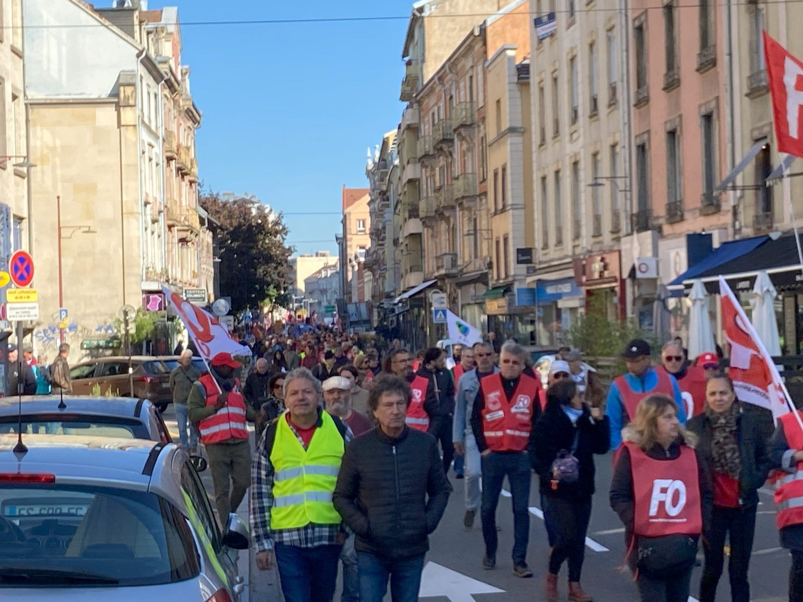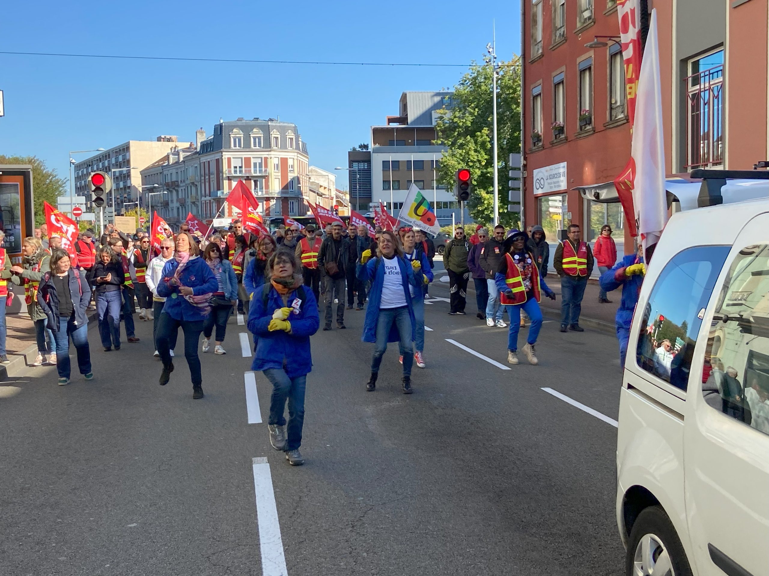 CGT, CFDT, CFE-CGC, FO, CFTC, FSU, Solidaires, Bloquons tout, LFI : les drapeaux des mouvements syndicaux et politiques étaient nombreux ce jeudi matin devant la Maison du Peuple de Belfort pour la troisième manifestation organisée depuis la rentrée scolaire. Si le nombre de manifestants était en baisse (750 selon la police, plus de 1000 selon les syndicats) par rapport à la dernière manifestation, la motivation restait la même. Les syndicats ont été rejoints à 10 h sur le parvis de la Maison du Peuple par un cortège de lycéens, qui ont pris la tête de la manifestation. Partis vers 10 h 15, les manifestants ont cheminé par le faubourg des Ancêtres, le pont Carnot, le quai Vallet, l’Atria, la place d’Armes et la préfecture où une prise de parole intersyndicale a été organisée. Les lycéens ont fait leur propre cortège à partir de l’Atria.