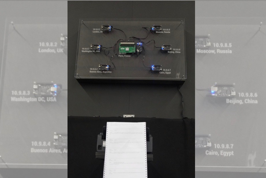 Masquerade a vu le jour à la suite des révélations du lanceur d’alerte Edward Snowden sur les pratiques de surveillance de masse de la National security agency (NSA), une agence américaine, via Internet. « Félicien Goguey voit ce projet comme un acte citoyen, à mener à une échelle collective », explique-t-on du côté de l’espace Gantner. L’œuvre met en scène un réseau de communication entre sept métropoles du monde : Washington, Le Caire, Buenos Aires, Moscou, Beijing, Londres et Paris. Ce réseau est alimenté par des échanges de phrases cohérentes gérées par un algorithme qui y place, à grande échelle, les mots clés liés à la menace terroriste : djihad, grenade, explosion… En une minute, le rapport papier, issu du traitement des données, dégringole en quantité de la machine sur le sol. « Heureusement que l’œuvre n’est pas connectée à Internet, sinon on verrait débarquer le GIGN dans les cinq minutes », s’amuse Joël M’Bajoumbé, chargé d’accueil multimédia à l’espace Gantner, qui assure la présence sur le stand. « Je trouve que l’œuvre est amusante et permet de savoir que les gouvernements peuvent récolter des données sur nous, explique un visiteur. Mais moi je ne poste quasi rien sur les réseaux sociaux car je n’ai pas envie d’étaler ma vie privée. »